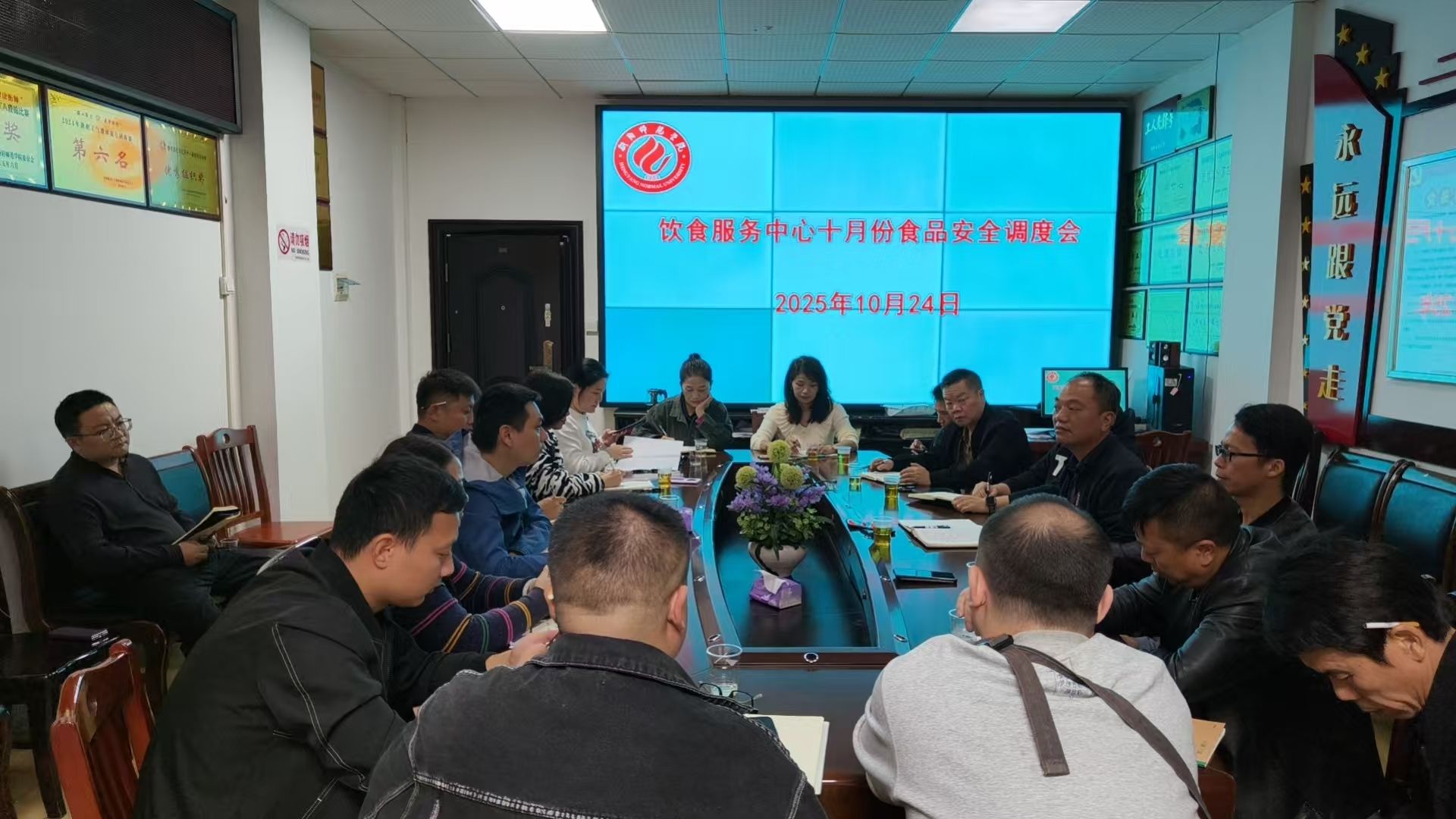2025年10月24日下午,受食品安全总监、后勤处处长常生良委托,分管饮食工作的副处长刘伦华组织召开十月份食品安全调度会,各食堂食品安全专员、各委托经营单位负责人、自营食堂劳务公司负责人和饮食服务中心全体员工参加会议。