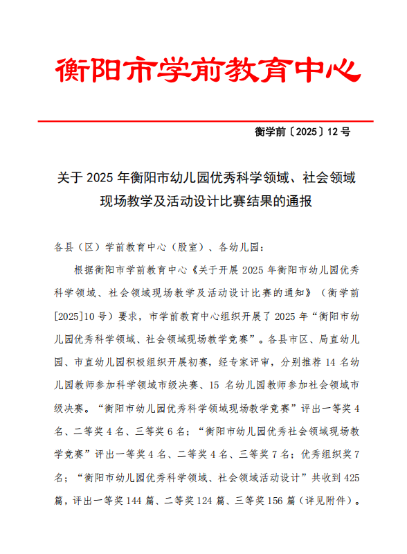 近日,2025年衡阳市幼儿园优秀科学领域、社会领域活动设计评选结果揭晓。我校幼儿园表现卓越,共有十项活动设计作品获奖,展现了该园在教学研究与实践创新方面的雄厚实力。